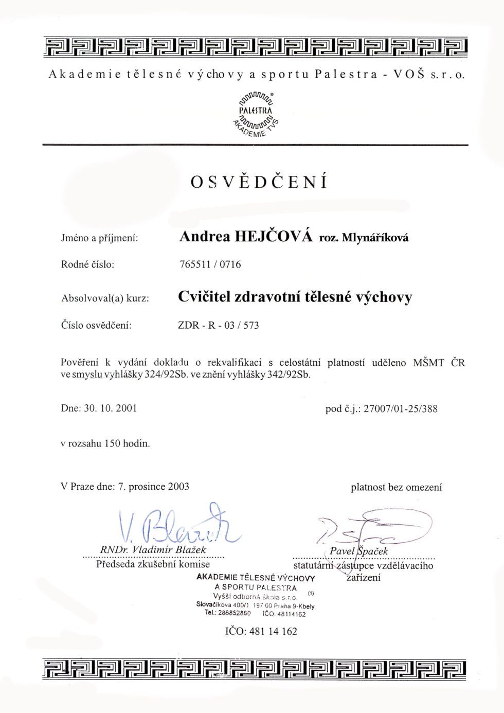 - V roce 2001 jsem absolvovala Rekvalifikační kurz, akreditovaný MŠMT, na Vysoké škole tělesné výchovy a sportu PALESTRA, spol. s r.o., v rozsahu 15O. učebních hodin, s oprávněním pro vydání Živnostenského listu a obdržela jsem Certifikát Cvičitele Zdravotní tělesné výchovy.
